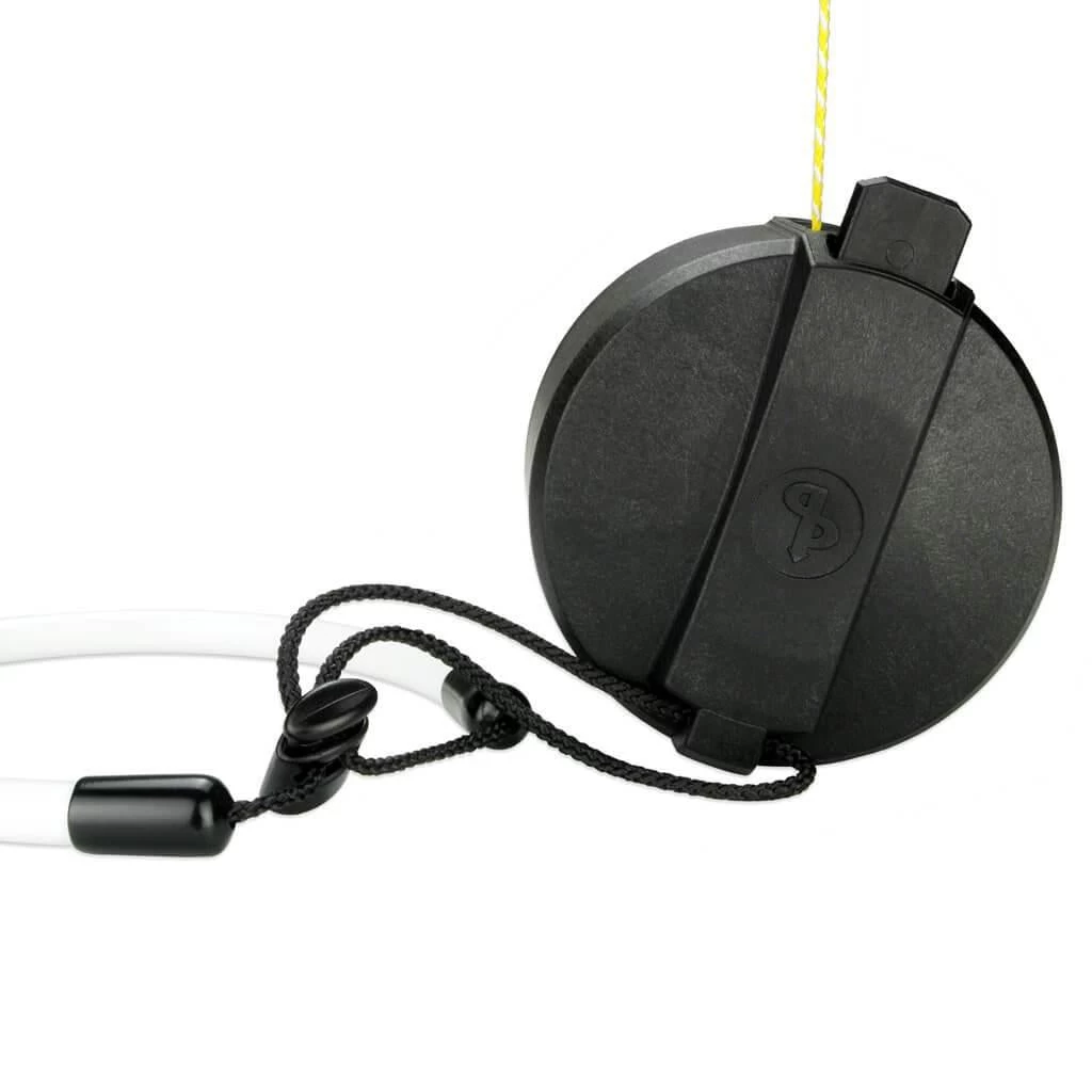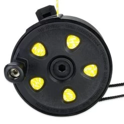 The Dyneema line is twice as strong as Kevlar and stronger than steel and the enclosed design of the reel prevents tangles which are more common when using an open reel. The mechanism has been developed to emit a loud audible click when winding in the line to aid the diver judge ascent speed as well as letting your buddy know that you are winding in.