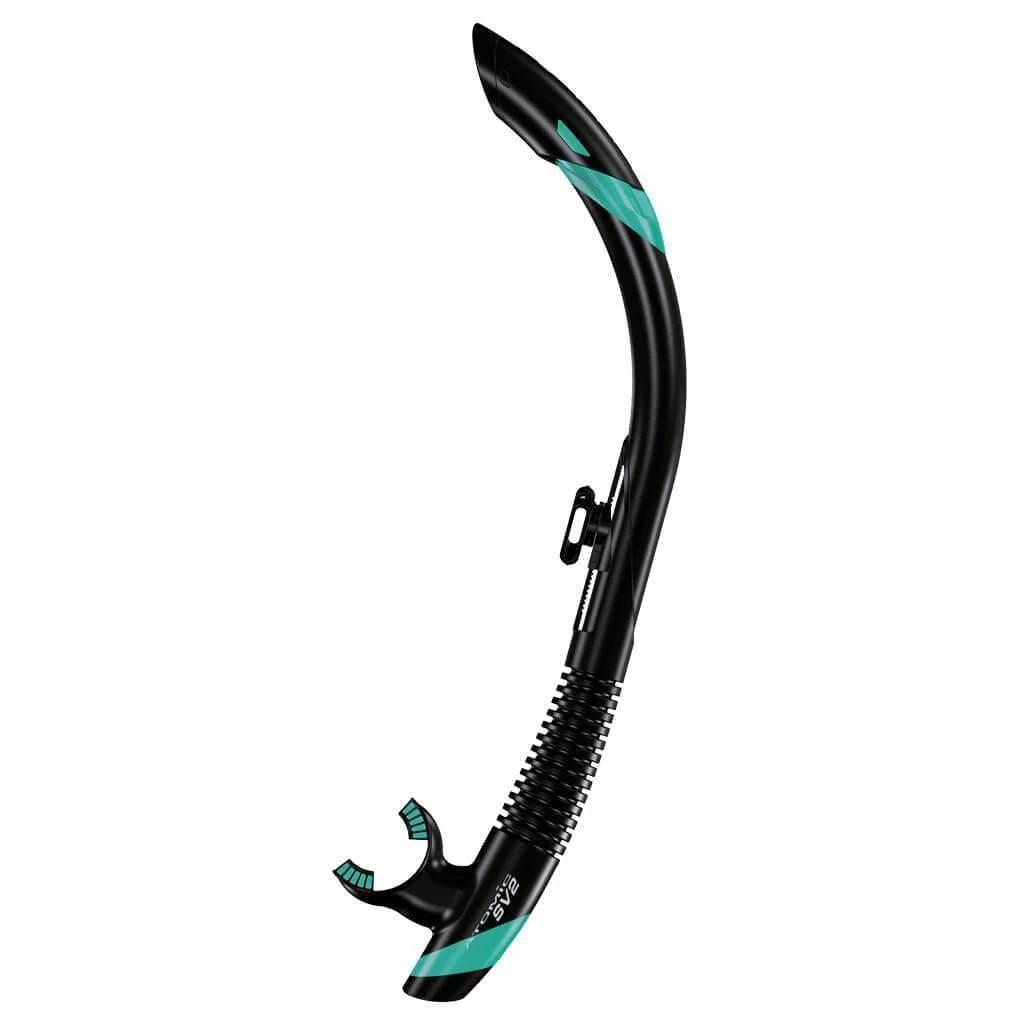 The snorkel tube is profiled and contoured to hug the side of the head which helps to reduce drag and buffeting as you swim through the water. The tube is fitted with a quick disconnect keeper that can slide up and down for optimal vertical positioning and also rotate for better mouthpiece orientation.