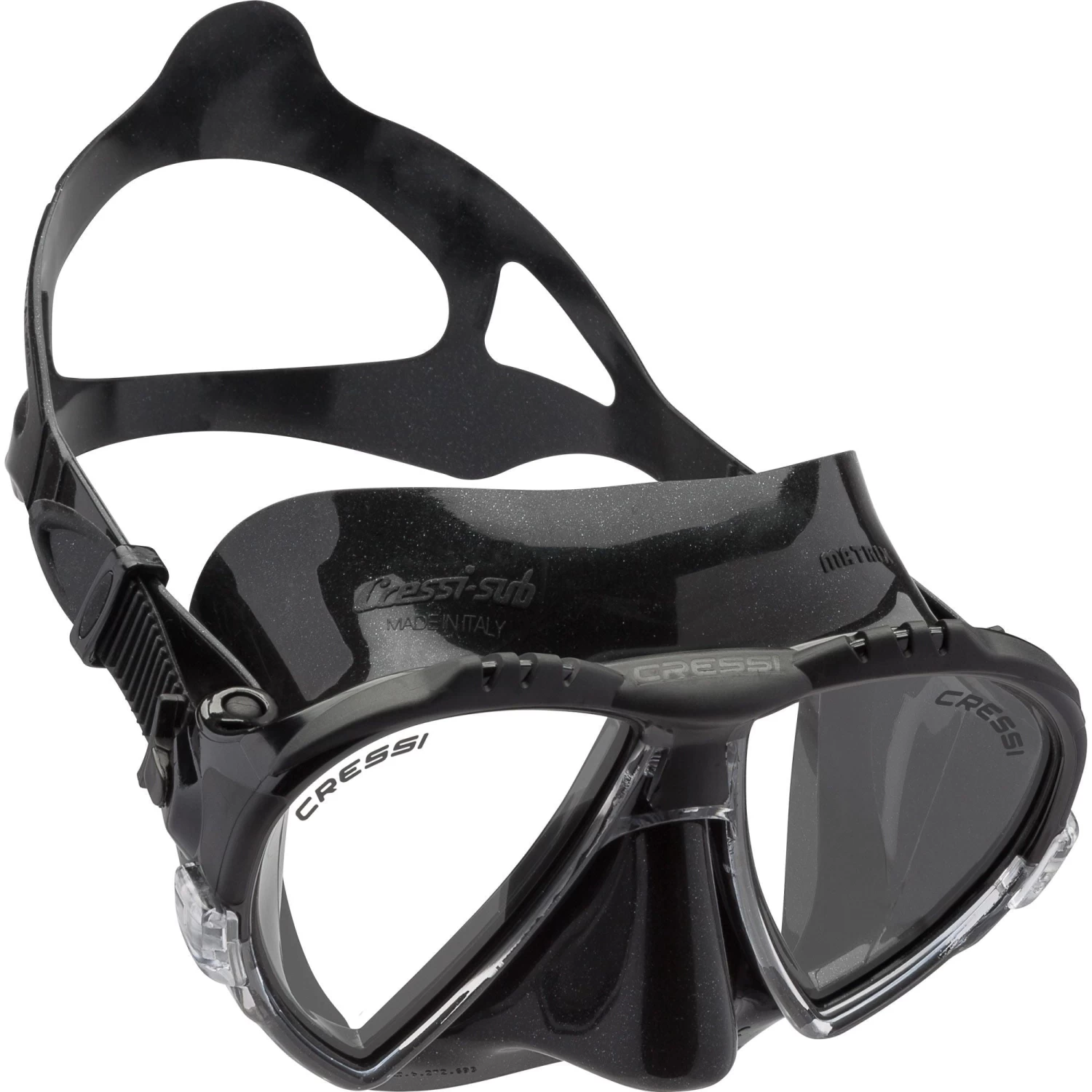 The Matrix Mask is equipped with Cressi patented Raked Lenses, which are now even closer to the eyes and have been taken to the maximum levels possible. The special “inverted drop” shape of the lens allows for an extremely wide field of vision with no optical distortion. The frame is also streamlined and ends up being completely invisible when worn. In addition, the top part of the mask has strong grip rubber material inserts for a great look.