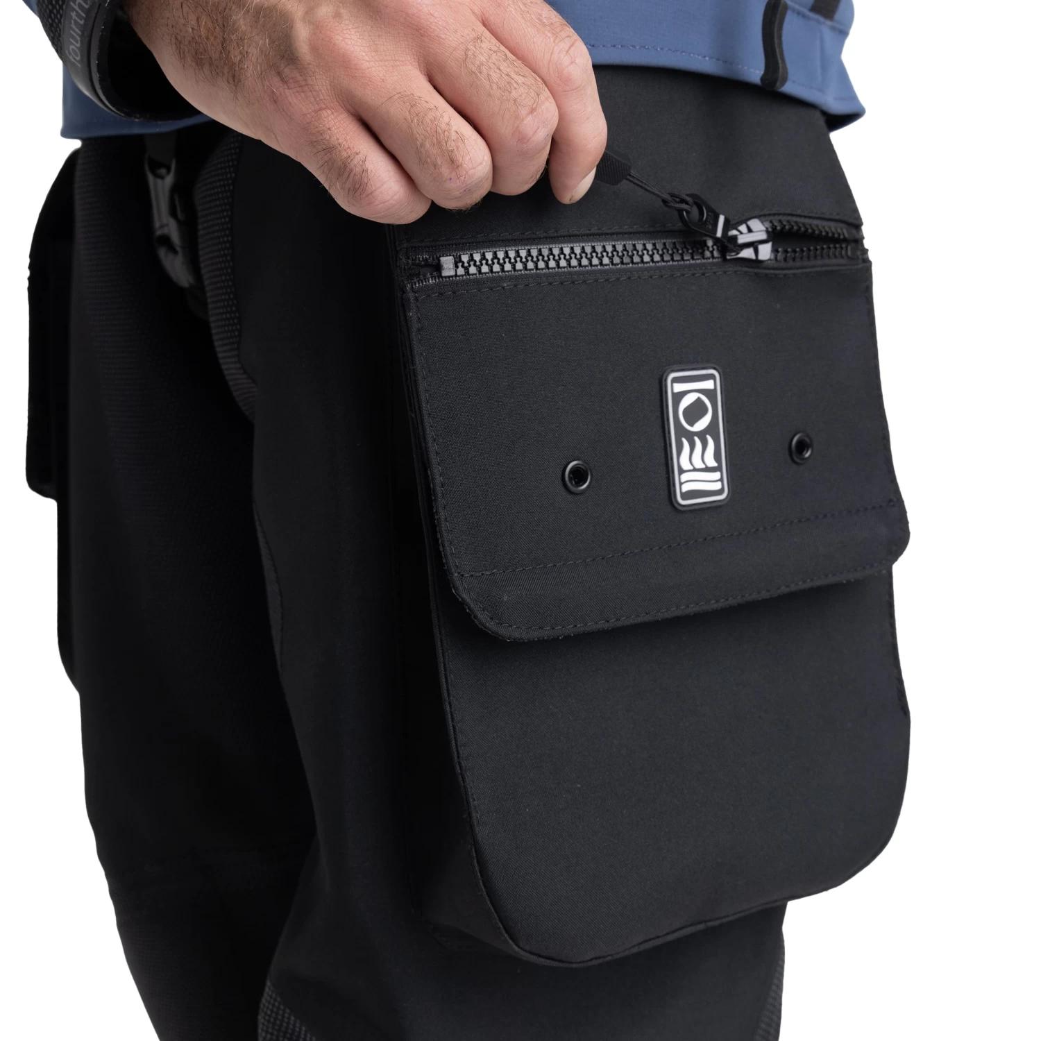 The drysuit features a composite dry zipper that runs from the right shoulder to the left hip, improving flexibility and fit while enhancing gas management when dumping air from the left shoulder. The Argonaut 3.0 can be specified with glued-in latex or neoprene wrist seals, the Ellipse wrist system, Si-Tech, QCP Ultima, or the new intuitive PSI system.