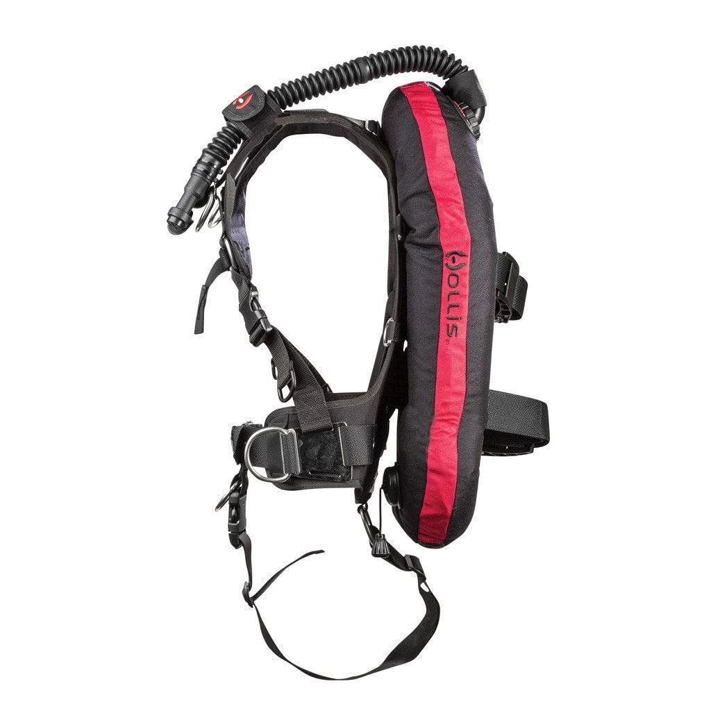 The harness is fitted with adjustable and quick releasing shoulder straps, sternum strap and crotch strap for quick setup and easy fitting and removal. A stainless steel belt buckle allows adjustment and tight securing of the waist strap. The contoured backpad provides plenty of lumber support to provide the back and spine. Large D-rings are mounted to the shoulders, hips and crotch strap to allow for stage cylinder attachment, ancillary equipment or scooters.