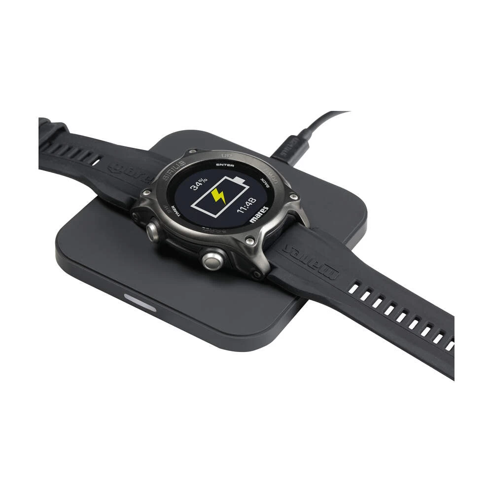 The Mares Sirius Dive Watch is powered by a rechargeable 200mAh battery which should provide enough power for 15-30 hours of dive time – depending on power and wireless integration settings. The battery has a lifetime of up to 500 cycles. Each Mares Sirius comes with a wireless touch charging station for quick, trouble-free charging.Â