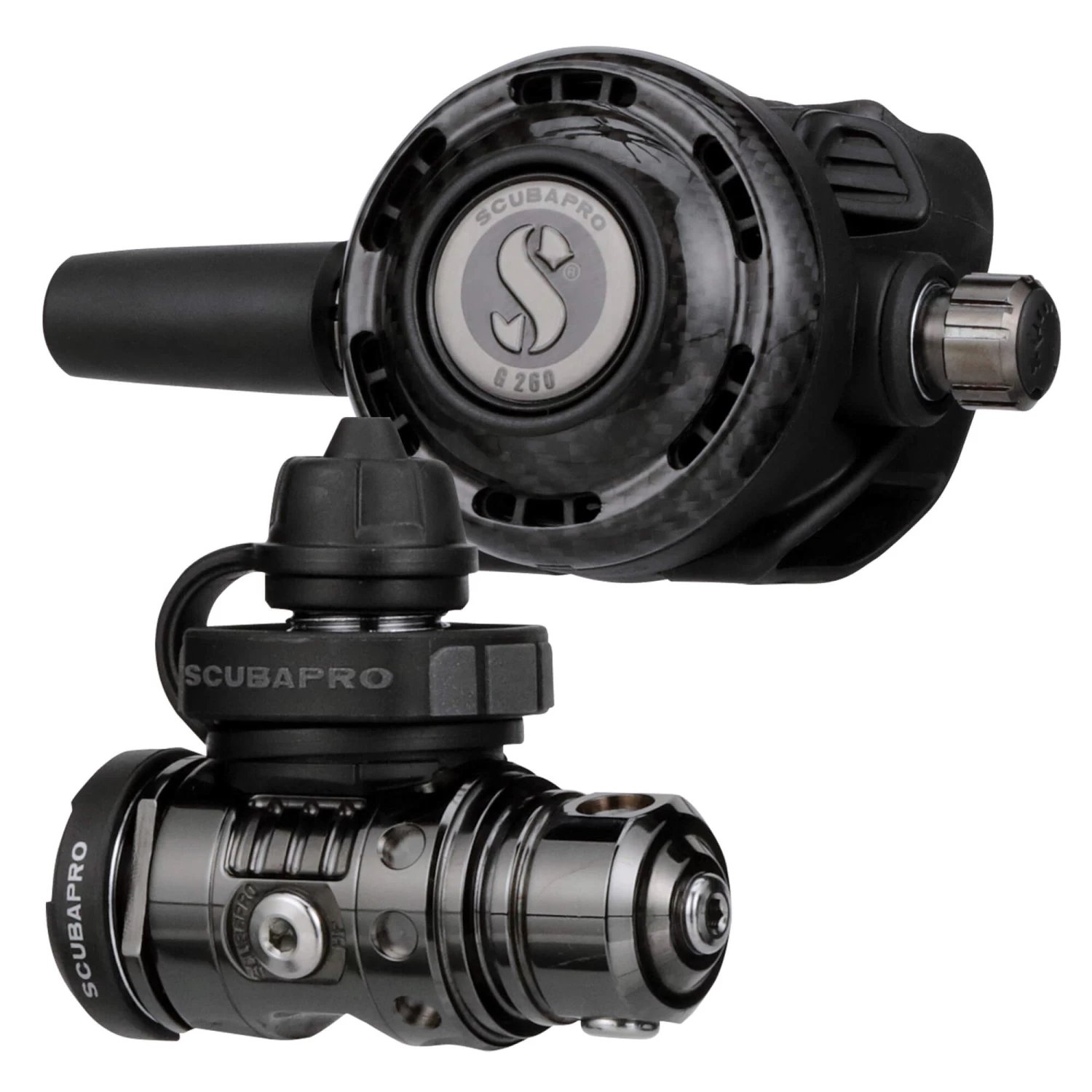The G260 is one of Scubapro’s most popular second stages. The large diaphragm, internal metal valve components and a high-flow exhaust valve give the second stage an effortless breathe and offers a high degree of resistance to freezing. Change out the standard front cover for a carbon fibre version and not only do you save weight but also significantly improve the impact protection. Give the external metal components a coat of Black Tech DLC for improved abrasion and minor scratch protection, and you have a winning second stage.