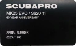 The MK25 S620ti Anniversary edition comes in a FSC-certified wooden box engraved with both SCUBAPRO and 60 Year Anniversary logos. A black anodized laser engraved aluminum tag carrying the progressive serial number matching the regulator is also included, highlighting the exclusivity of this limited edition regulator for collectors.