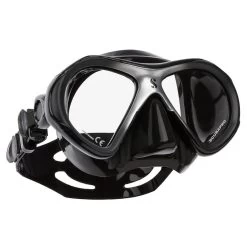 Compact two-window design. Swivel buckles for easy adjustment. Tempered glass lenses. Crystal clear or black double sealed silicone skirt. Exclusive paint process- giving your mask the rich look of stylish eye-wear- underwater.