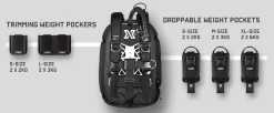 XDeep droppable weight pockets can accommodate up to 6 kg of weight, making them ideal for cold-water dives where dry suits, thick undergarments, or thick wet suits require additional weight. The adjustment system allows for easy capacity reduction for warm-water dives, eliminating the need to change the pockets during your dive trip.